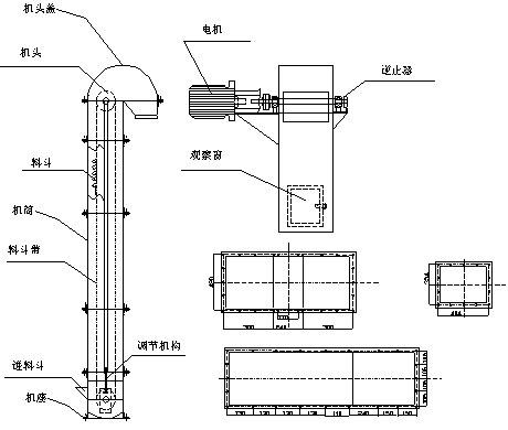 斗式提升機(jī)將物料傾入接受槽內(nèi)。帶傳動(dòng)的斗式提升機(jī)的傳動(dòng)帶一般采用橡膠帶,裝在下或上面的傳動(dòng)滾筒和上下面的改向滾筒上。鏈傳動(dòng)的斗式提升機(jī)一般裝有兩